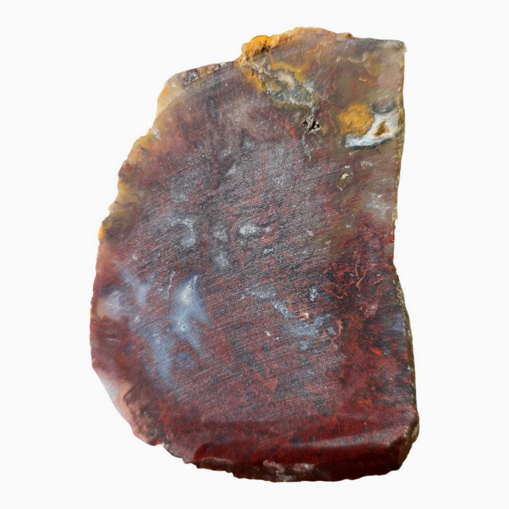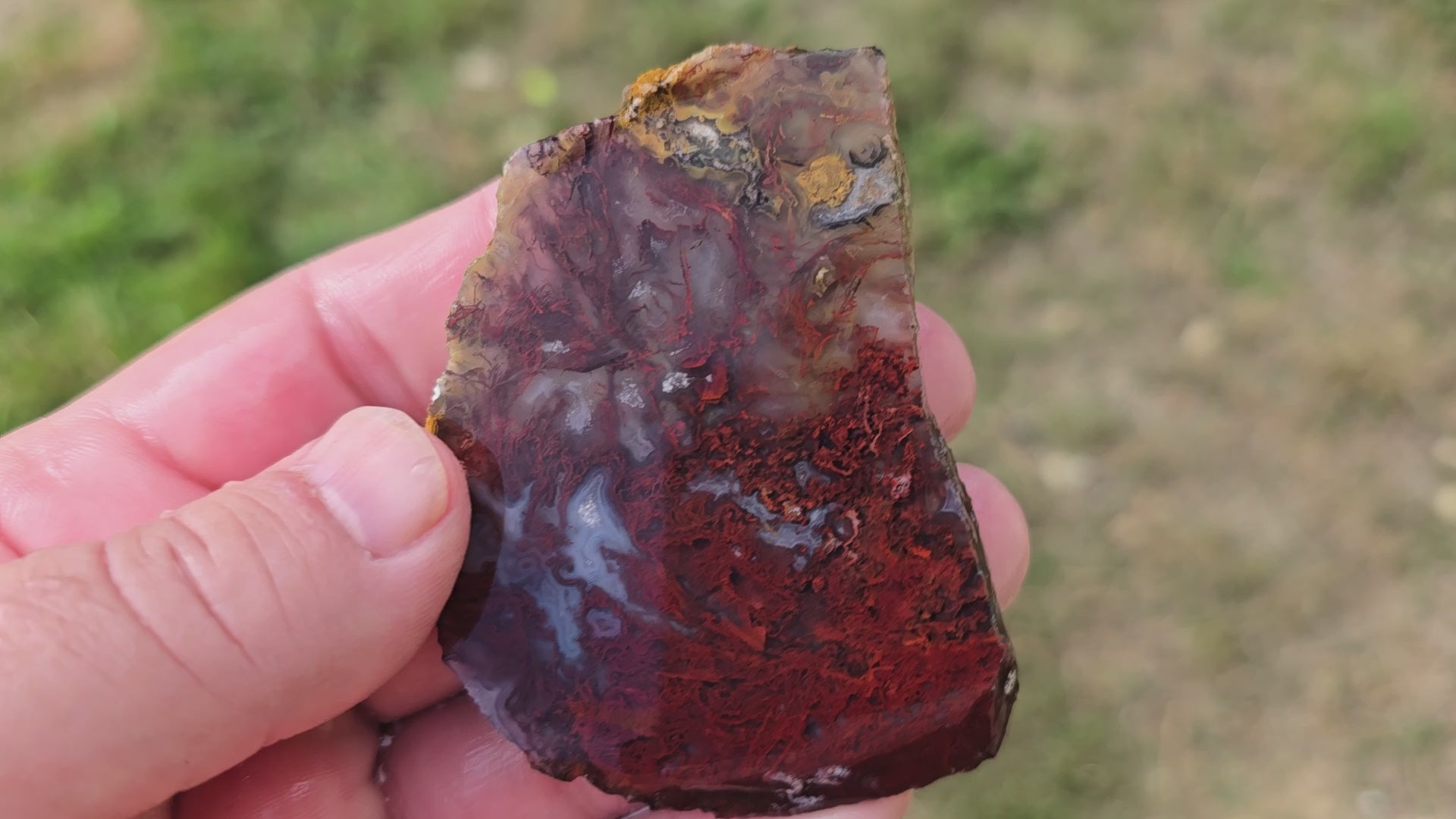This nice slab features gorgeous bright red moss reminiscent of Carey plume agate. Blue agate inclusions blend with quartz-filled pockets creating natural scene potential for design-grade cabochons. This well-defined moss should polish up beautifully.