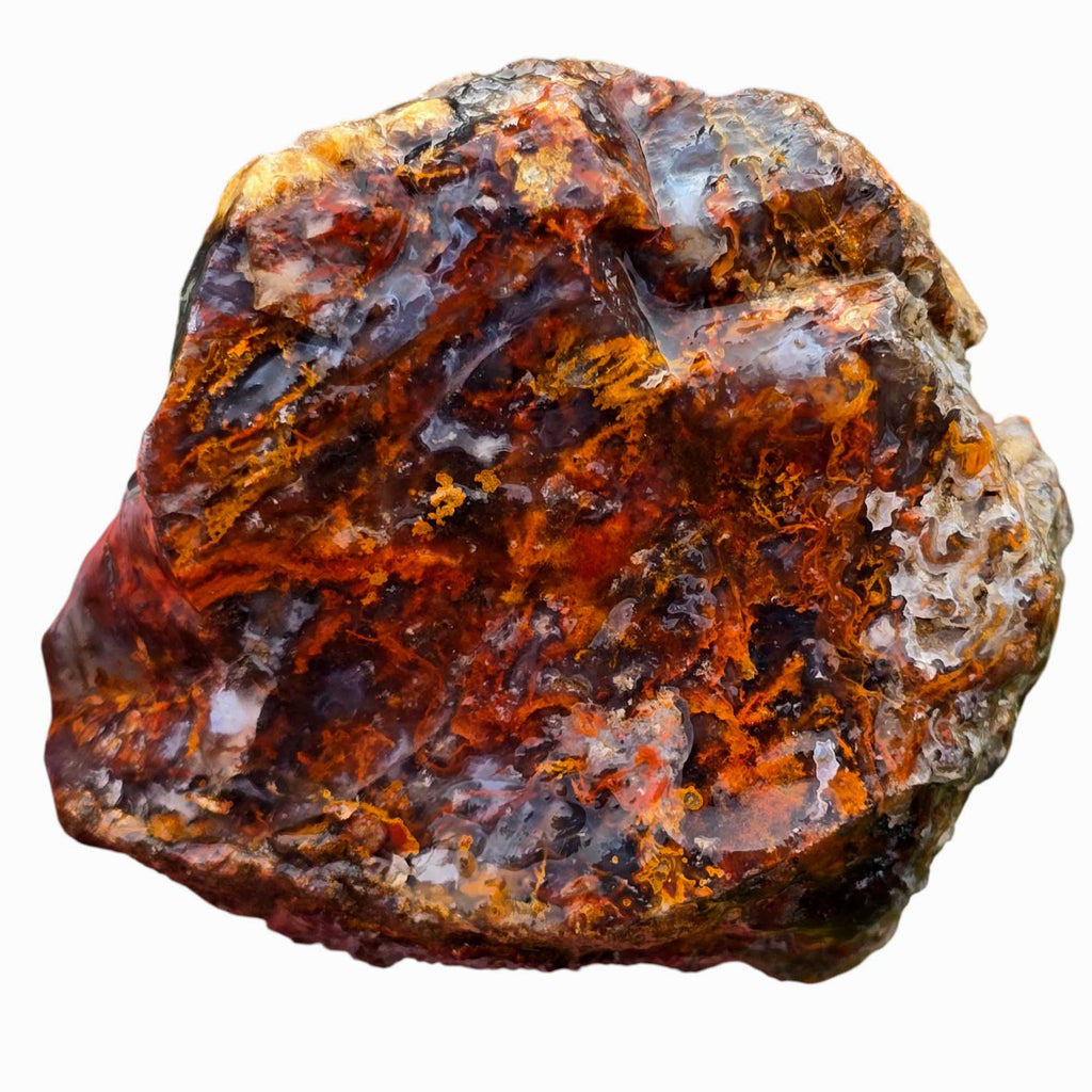 This San Carlos Agate rough trimmer showcases smoky orange and red moss inclusions suspended in translucent blue agate. Its striking color contrast and unique moss structures make it an excellent choice for cabbing or display.
