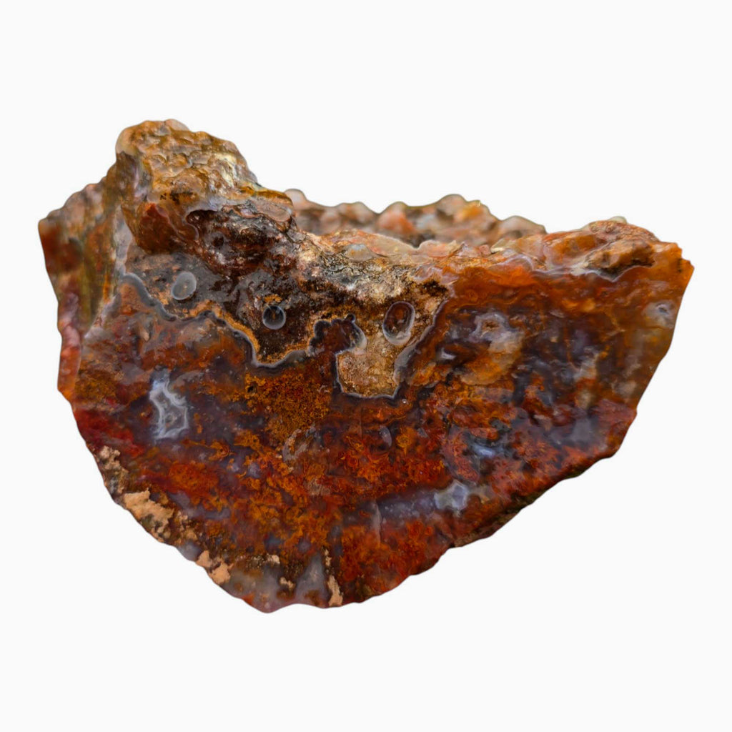 This San Carlos Agate rough showcases vivid orange moss agate combined with fascinating tube botryoidal formations along the top. With its strong color contrast and unique structure, this piece offers excellent slabbing potential for cabochons, but its natural texture and botryoidal details also make it a striking display specimen as-is.
