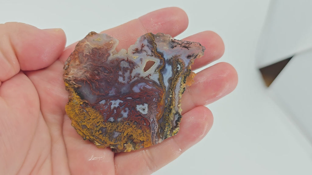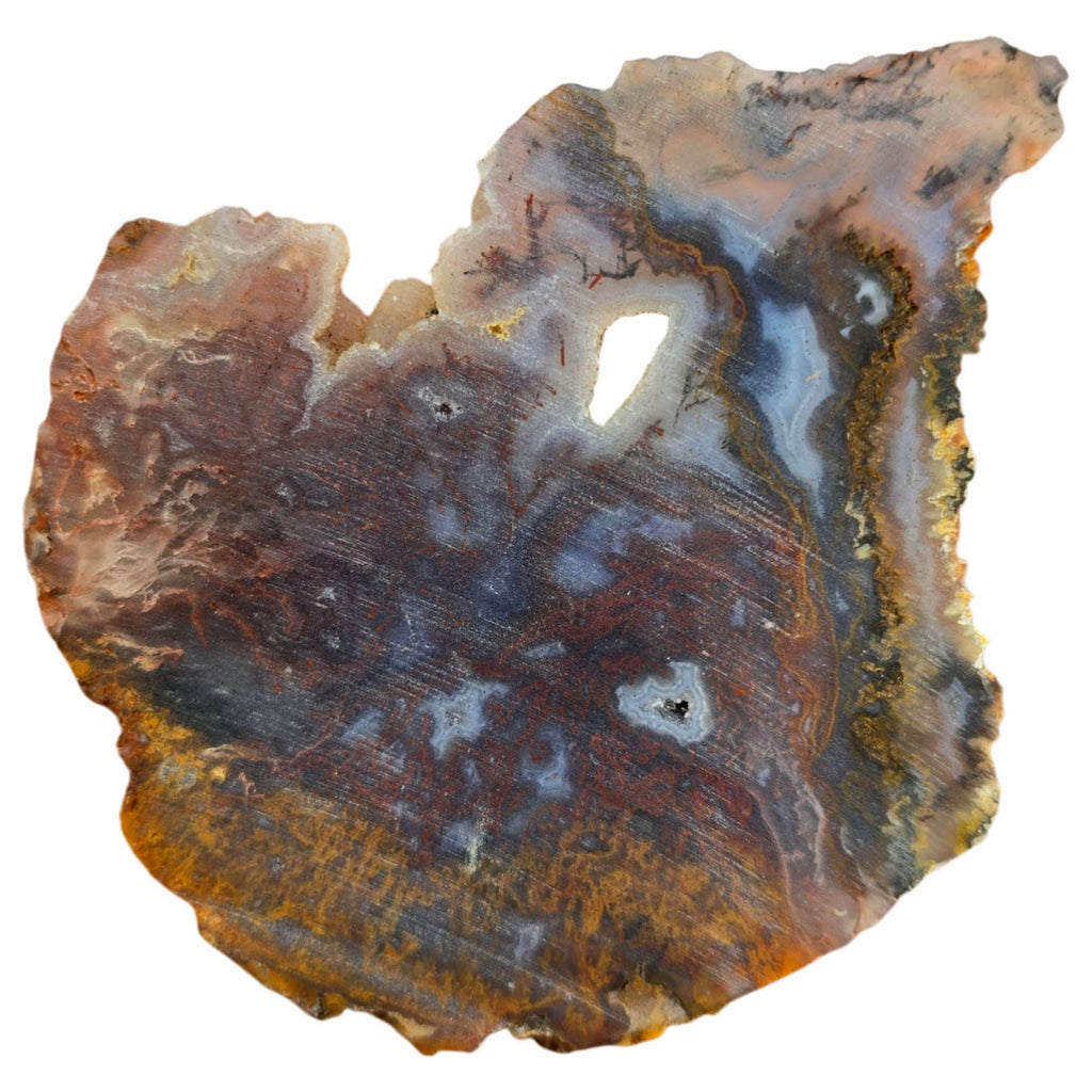 This piece features exceptional multicolor moss in red, orange, and purple tones. The drusy pockets add natural sparkle and the blue agate areas create beautiful contrast.