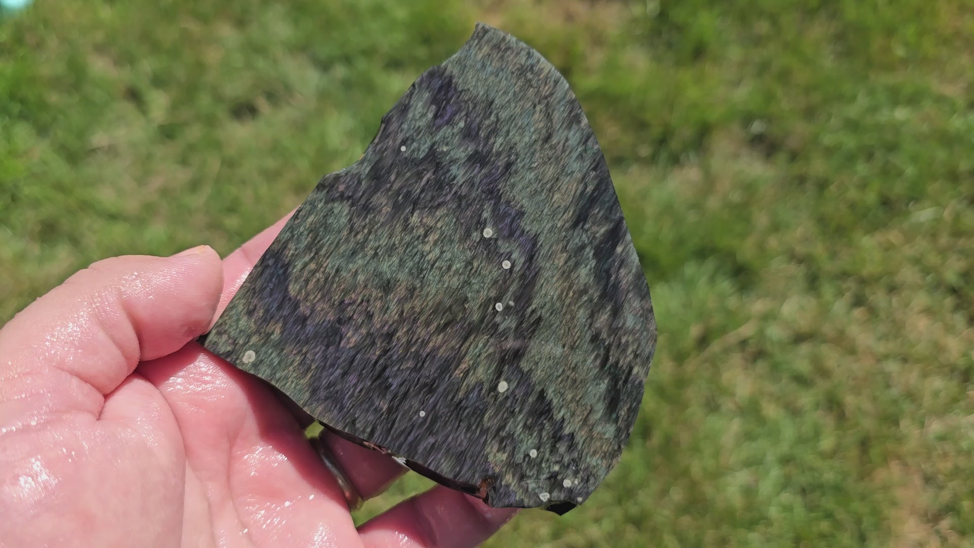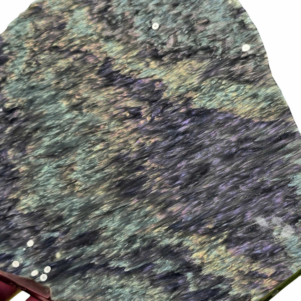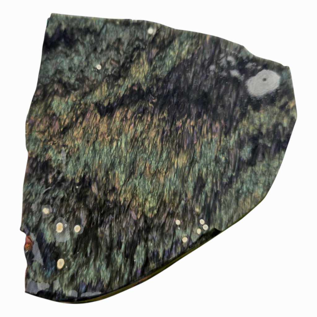 This slab is on the thicker side and loaded with magnetite and vibrant flash. It has excellent coloration and movement under light, and should cut into some striking cabochons or make a bold display piece in any collection.
