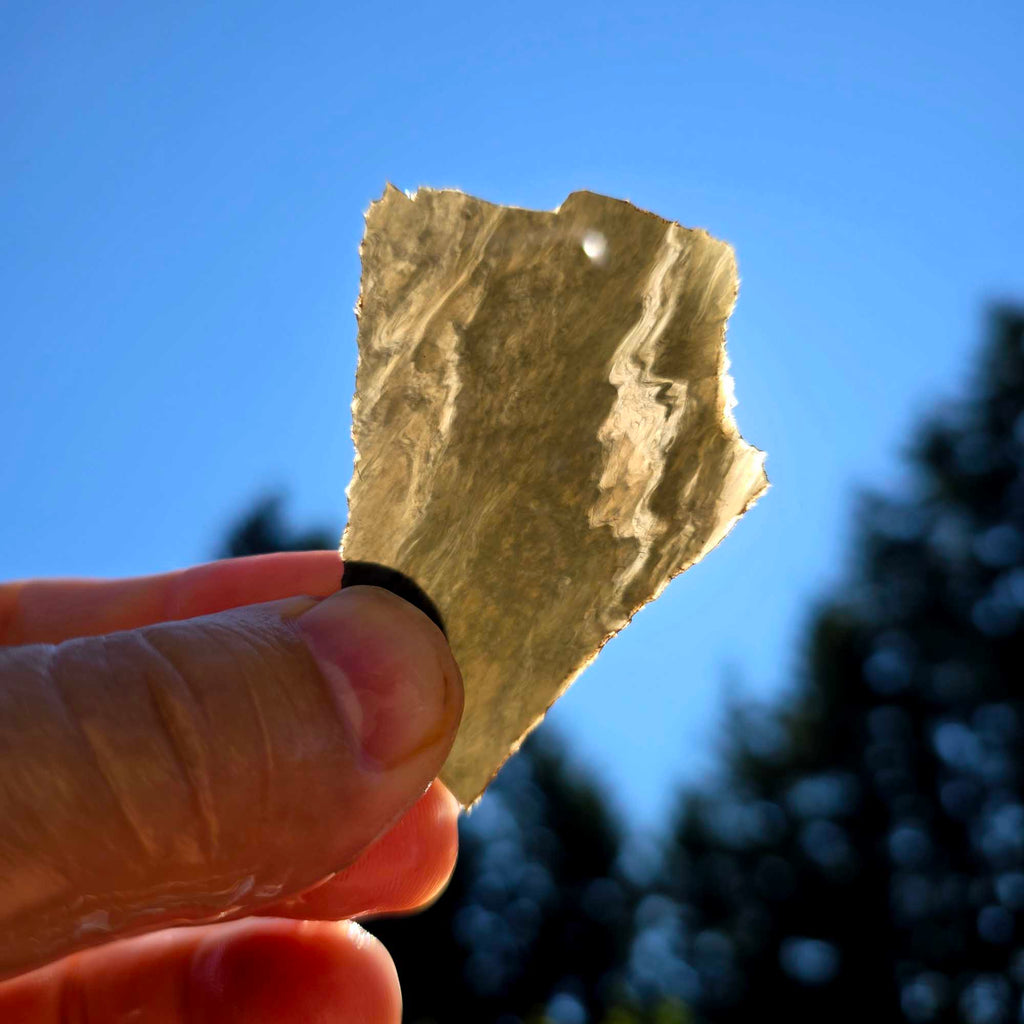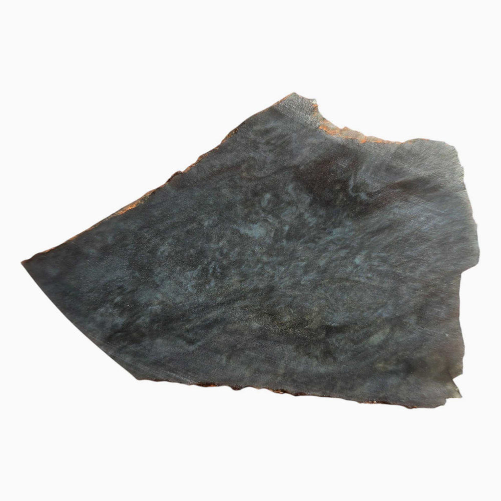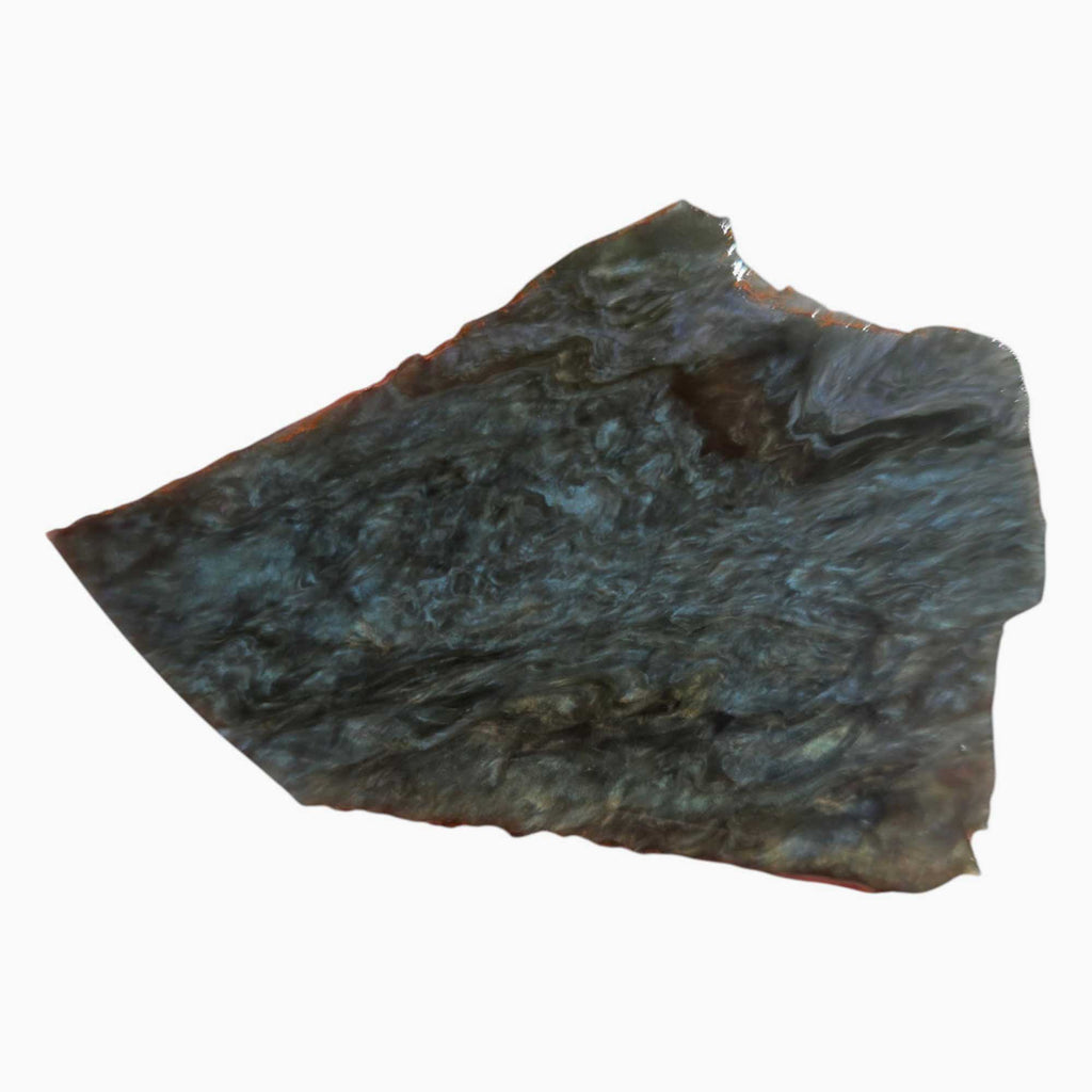 This slab has been cut very thin as part of a cutting experiment requested by a fellow rock enthusiast curious about how Velvet Obsidian appears when sliced ultra-thin. While it shows flowing structure under backlight, the magnetite content doesn’t capture enough light when backlit to reveal the sheen. Being so thin, this piece is very delicate and must be handled with care. It still exhibits visible chatoyance under angled light and may be appreciated best as a collector slice.