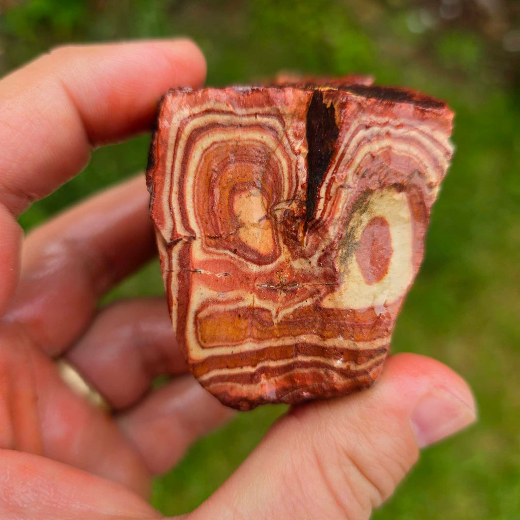 Wonderstone is a vintage favorite among lapidarists, known for its dreamy, wavy patterns and warm, sunset-inspired colors. This striking material often displays layered bullseye formations in hues of red, gold, cream, purple, and tan, believed to have formed through the slow osmosis of mineral-rich water as the stone developed.